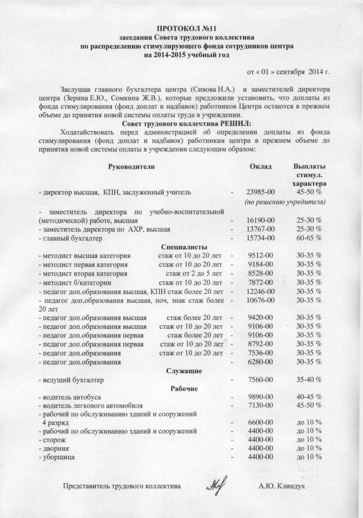 Опубликован Протокол №11 заседания трудового коллектива по распределению стимулирующего фонда сотрудников центра на 2014-15 учебный год от 01 сентября 2014 г.